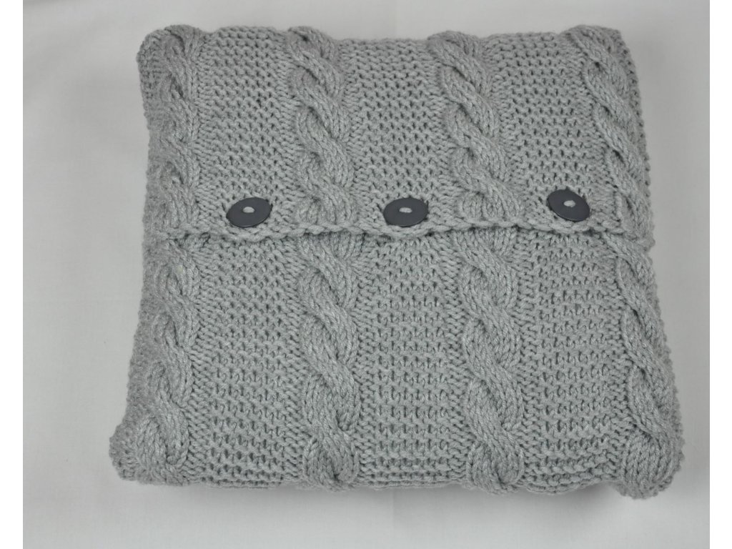 Originální polštářek je upletený z velmi příjemné a měkké akrylové příze a zapíná se na ozdobné knoflíky. Vytvořila jsem ho pro Vás v České republice v Beskydech.